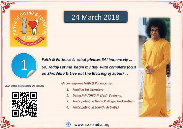 Sai Inspires, 31.MAR.2018 Om Sri Sai Ram Jesus underwent several trials and tribulations during His time. He became the Saviour and Messiah of the poor and forlorn, helping them in many ways. Once while crossing the desert, a poor woman approached Him begging for food. He gave her bread saying, “Take this”. When someone enquired where bread came from, Jesus replied that it was Divine will. There is nothing greater than Divine Will. Everything is God’s will. The foremost duty of a human being is to realise the will of God and submit oneself to that Divine will. People today are blind, having lost both their eyes of faith. Faith is the basis for all creation. Hence first and foremost, develop faith. Where there is faith and love, everything else will be added unto such a person. Many people have faith, but lack love. Faith devoid of love has no use. Love and faith must be together like mutually attractive magnetic poles. – Divine Discourse, Dec 26, 2007. Sathya Sai Baba http://bit.ly/2FTXeXk #sathyasai #saibhakta 31 de março de 2018Saibhakta Brasil View on Instagram http://bit.ly/2IhfQRo