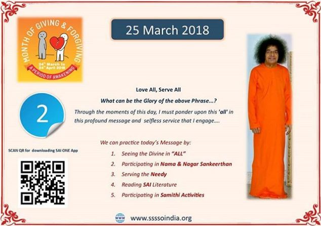 Sai Inspires, 26.MAR.2018 Om Sri Sai Ram Embodiments of Love! The story of Rama is not an ancient one. It is eternal and ever new. It is full of auspiciousness. When you contemplate on Rama incessantly, you derive great joy and delight! Ramayana teaches the principles of righteousness (dharma) and the path of duty to every individual. Ramayana sets an ideal to parents, brothers, and sisters in every family and to humanity! It is to understand and assimilate the principle of Ramayana that we are celebrating the festival of Rama Navami today. It is not enough if the celebration is confined to merely partaking of sweet pudding and other delicious items. May you fill your heart with the sacred ideals of the Ramayana! Obey the commands of Lord Rama. Pain and pleasure, sorrow and happiness follow one another. One should treat them with equanimity. May you give up hatred and all differences. May you live in peace and harmony! Sathya Sai Baba – Divine Discourse, Apr 11, 2003 http://bit.ly/2FTXeXk #sathyasai #saibhakta 26 de março de 2018Saibhakta Brasil View on Instagram http://bit.ly/2G4VvlG
