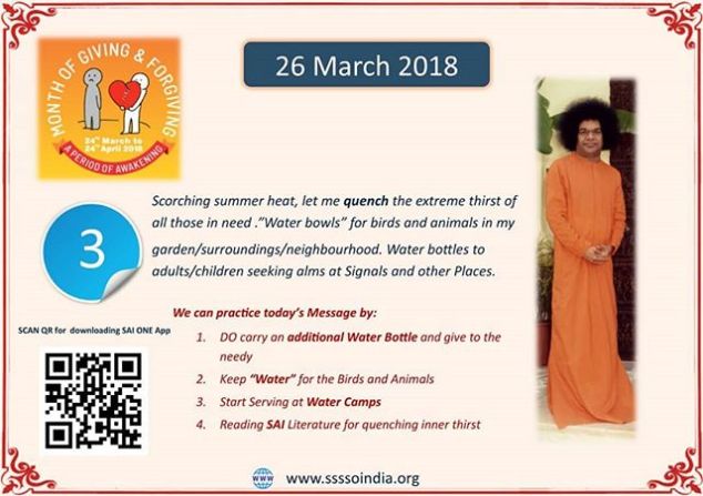Hebrew, 26.MAR.2018 Om Sri Sai Ram מחשבה להיום, כפי שכתובה בפרשאנטי נילאיים, 26.3.2018 כל אחד צריך לעבור את מצוקות החיים. זה טבעו של pravritti הנתיב החיצוני .יש היבט נוסף לחיים – nivritti נתיב פנימי. ילד הולך לאמו ואומר, “אני רעב “האם העוקבת אחר הנתיב החיצוני אומרת, “ילד, לך לאכול, הרעב שלך יעבור ותהייה שבע”. זהו הנתיב החיצוני. אך האם ההולכת בנתיב הפנימי אינה אומרת זאת. היא הייתה מייעצת לילד לגבי איזה סוג של מזון לאכול, מתי ואיך לאכול. האם העוקבת אחר הנתיב הפנימי מייעצת לך לאכול מזון כזה אשר יעניק לך בריאות טובה. יכולים להיות לך רצונות, אבל הם צריכים להיות תחת הגבלות. הם צריכים להיות מבוססים על האמת ועל הצדק. אל תאכל את כול מה שאתה מקבל. אל תדבר את כול שעולה בדעתך. דבר רק לאחר בדיקה נכונה. הראמאיאנה מלמדת את שני ההיבטים של החיים: הנתיב הפנימי והנתיב החיצוני בצורה יפהפייה. אין מוסר גבוה יותר מהמתואר בה. הראמאיאנה צריכה להיות מושא הפולחן שלנו. השיח האלוהי, מתוך נאומו של שרי סאטיה סאי באבא, 11 באפריל 2003 Sathya Sai Baba http://bit.ly/2EJCALE #sathyasai #saibhakta 26 de março de 2018Saibhakta Brasil View on Instagram http://bit.ly/2G6kUeS