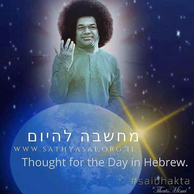 Hebrew, 17.MAR.2018 Om Sri Sai Ram מחשבה להיום, כפי שכתובה בפרשאנטי נילאיים 17.3.2018 ישנם אנשים שקמים מהמיטה עם מחשבות טורדות ודאגות. אל תעשו זאת! קומו מהשינה בהכרה שקטה. חישבו על אלוהים. אם ההורים מעבירים ביקורת האחד על השני מיד כשהם יוצאים מהמיטה, לבטח הילדים גם כן יתחילו לריב האחד עם השני! ילדים תמיד מנסים לחקות את הוריהם, לכן על ההורים להוות דוגמה לילדיהם. עליכם ללמד אותם על ידי המעשים שלכם ולא רק בדיבור. בכול המצבים אל תתנו מקום לכעס או לשנאה. לעולם אל תשנאו אף אחד. הכעס שלכם יחזור אליכם כבבואה ויביא עליכם סבל. יהיה עליכם להתמודד עם מידה מסוימת של קשיים וצער, אך אל תדאגו. היו רגועים ומושלים ברוחכם. החשיבו כול אחד כהתגלמות אלוהית. הברכה או הלעג שלכם, לכול מי שהיא תהייה מופנית, מגיעה אל אלוהים. נהגו בכבוד כלפי כולם. חלקו את אהבתכם עם כול אחד ועם כולם. השיח האלוהי, מתוך נאומו של שרי סאטיה סאי באבא 2 לאפריל 2003 Sathya Sai Baba http://bit.ly/2EJCALE #sathyasai #saibhakta 17 de março de 2018Saibhakta Brasil View on Instagram http://bit.ly/2G5udL2