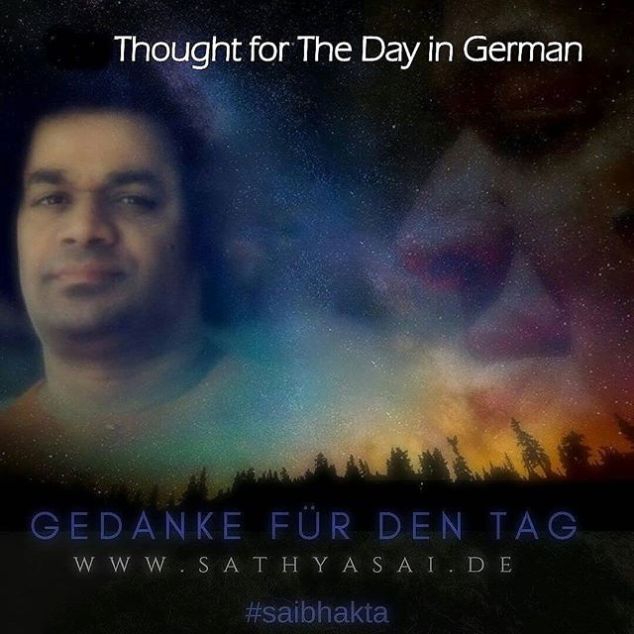 German, 14.OCT.2018 Om Sri Sai Ram GEDANKE DES TAGES AUS PRASANTHI NILAYAM VOM 14. OKTOBER 2018 Im Mahavakya der Veden, Tat Twam Asi (Das Bist Du), bezeichnet Tat das, was draußen ist, und Twam steht für die angeborene Göttlichkeit. Es bedeutet, dass dieselbe Göttlichkeit innerhalb und außerhalb vorhanden ist. Antarbahischa Tatsarvam Vyapya Narayana Stitaha (Dass jeder allgegenwärtige Gott innerhalb und außerhalb anwesend ist). Das, was draußen gesehen, gehört und erfahren wird, ist nichts als die Reflexion, das Echo und die Reaktion des inneren Wesens. Wenn die Realität in dir ist, warum sehnst du dich nach draußen, nach der äußeren Wirklichkeit? Es ist reiner Wahnsinn. Der Mensch ist die Verkörperung der Zeit. Der Mensch ist der Herr der Zeit. Um seine innere Wirklichkeit zu verstehen, muss man den Geist (mind – Verstand) kontrollieren. Daher heißt es: Meister den Verstand und sei der Meisterverstand. Die fünf Elemente, die draußen wahrzunehmen sind, sind auch in dir gegenwärtig. Du bist der Meister der fünf Elemente. Du solltest den Geist kontrollieren und kein Sklave von ihm werden.. Ansprache von Sathya Sai Baba, 9. Oktober 2001 Sathya Sai Baba http://bit.ly/2FTXeXk #sathyasai #saibhakta #dailysaigram #saimaa #sathyasaibaba 14 de outubro de 2018Saibhakta Brasil View on Instagram http://bit.ly/2QJVK6o
