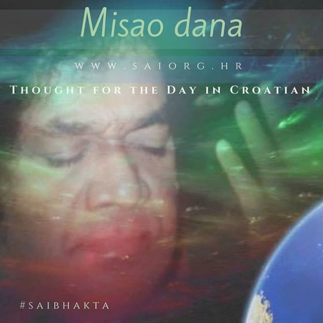 Croatian, 27.JUN.2018 Om Sri Sai Ram Misao dana 27. 6. 2018. Proces života je ljuljanje njihala od osmijeha do suza. Djetinjstvo je jako nježno i nevino, mladost je prepuna ludosti i pogrešaka, srednje su godine opterećene problemima i mogućim rješenjima, a starost se provodi u tuzi zbog učinjenih neuspjeha. Kad možete iskusiti malo iskrene sreće? Radosti i tuge posljedica su toga što se um bavi prolaznim i trivijalnim. Unutarnja srž svakog živog bića je Bog. Sunce nije okaljano kad njegove zrake padnu na nešto štetno. Ni Sebstvo se ne mijenja uslijed djelovanja uma koji slijepo slijedi osjetila. Kad netko osvijesti da je Sebstvo Bog, ne može ga proganjati strah od smrti. Vjera je život, nedostatak vjere je smrt. Samo tijelo umire, božansko Sebstvo (atma) je iznad rođenja i smrti. Svjesna toga osoba je uronjena u božansko blaženstvo (ananda). (Božanski govor, 8.siječnja 1983.) Sathya Sai Baba http://bit.ly/2FGoaZq #sathyasai #saibhakta #dailysaigram 28 de junho de 2018Saibhakta Brasil View on Instagram http://bit.ly/2MuVdDl