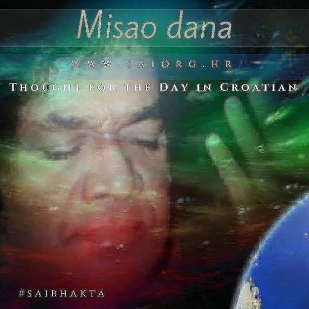 Croatian, 18.06.2018 Om Sri Sai Ram Misao dana 18. 6. 2018. Možda dolazite iz puno zemalja i različitih kultura i tradicija, jezika i stilova oblačenja, itd. Ali ta raznolikost ne bi trebala od našeg vida zakloniti jedinstvo Božanstva svojstvenog svima vama. Svijet danas je pogođen mnogim problemima i strahom koji se brzo širi (strahom od rata, gladi i demonskih terorista te problemima rasnih, religijskih i regionalnih sukoba, gospodarskog oporavka i preživljavanja, nediscipline učenika i studenata, vjerskih sukoba, histerije i fanatizma, borbe za moći i ekstremnog egoizma). Jedini lijek za ovaj prikradajući strah je stav nevezanosti (vairagyam). Kad je netko vezan za kompleks tijelo-um i time ograničen na „ja i moje“, strah je neizbježan. Nedvojna (advaitska) svijest da je ono čemu svjedočimo samo interpretacija našeg uma o stvarnosti, najbolji je lijek, a služenje najučinkovitija sadhana. (Božanski govor, 21. studenoga 1985.) Sathya Sai Baba http://bit.ly/2FGoaZq #sathyasai #saibhakta #dailysaigram 19 de junho de 2018Saibhakta Brasil View on Instagram http://bit.ly/2t7dPlt
