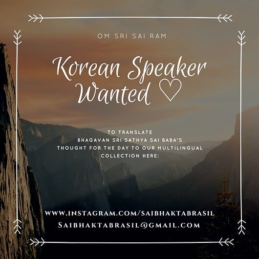 Sai Ram ❤ Korean Translator wanted, to join our Daily Divine Sai Baba’s Thought for the Day ♡♡♡. Please share this invitation to a beautigul seva and help us to find this dear Soul ❤ Om Sai Ram 26 de abril de 2018Saibhakta Brasil View on Instagram http://bit.ly/2Hv6CVX